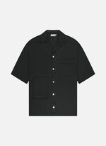 Utility Smart Shirt in black for men. A utility shirt combining structure with functional detailing. Made from 77% polyester, 20% rayon and 3% spandex, designed with short sleeves and a button-up front closure with a revere collar. Non-identical front patch pockets, a straight hem and an injection logo print complete the design. This shirt has a boxy fit.