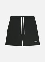 Sage Shorts in black for men. A heavyweight short designed with relaxed structure and raw detailing. Made from 100% cotton in a 500 GSM heavy weight fabric. The design features a self fabric elastic encased gathered waistband, visible drawcords and concealed side pockets. A distressed raw edge opening with contrast revealing logo appears on the leg. These shorts have a comfort fit.