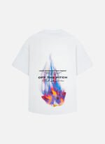 The Burning Flower Oversized T-shirt in white for men. A relaxed T-shirt with symbolic fire print. This oversized cotton T-shirt is defined by a large back print of a burning flower and a flame-accented chest graphic. The 2x1 rib collar and single-needle hem keep it clean and structured. Branding appears under the chest graphic and on the back. This T-shirt has an oversized fit.